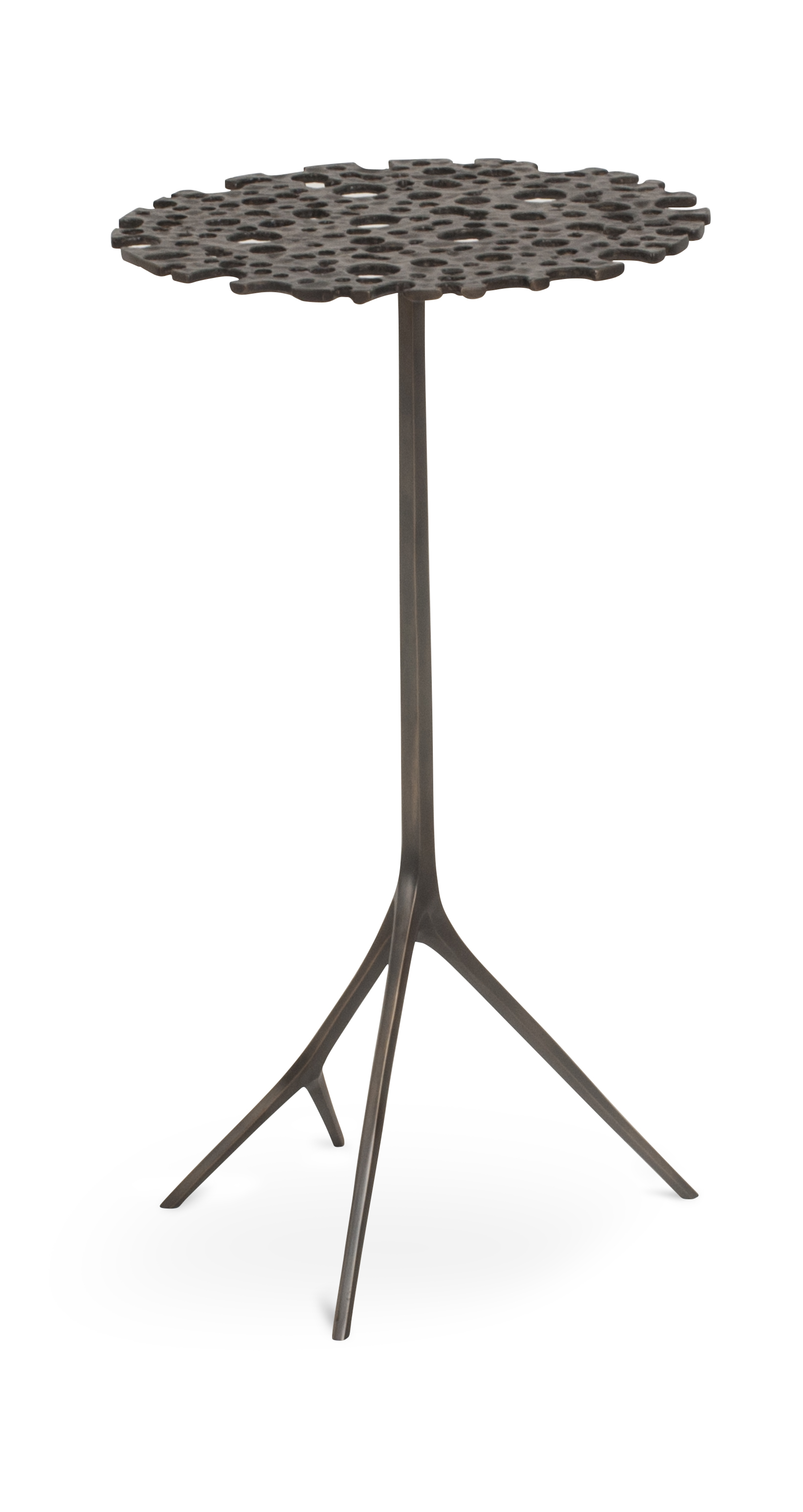 Sand cast brass table with perforated top motif, subtly faceted stem and legs