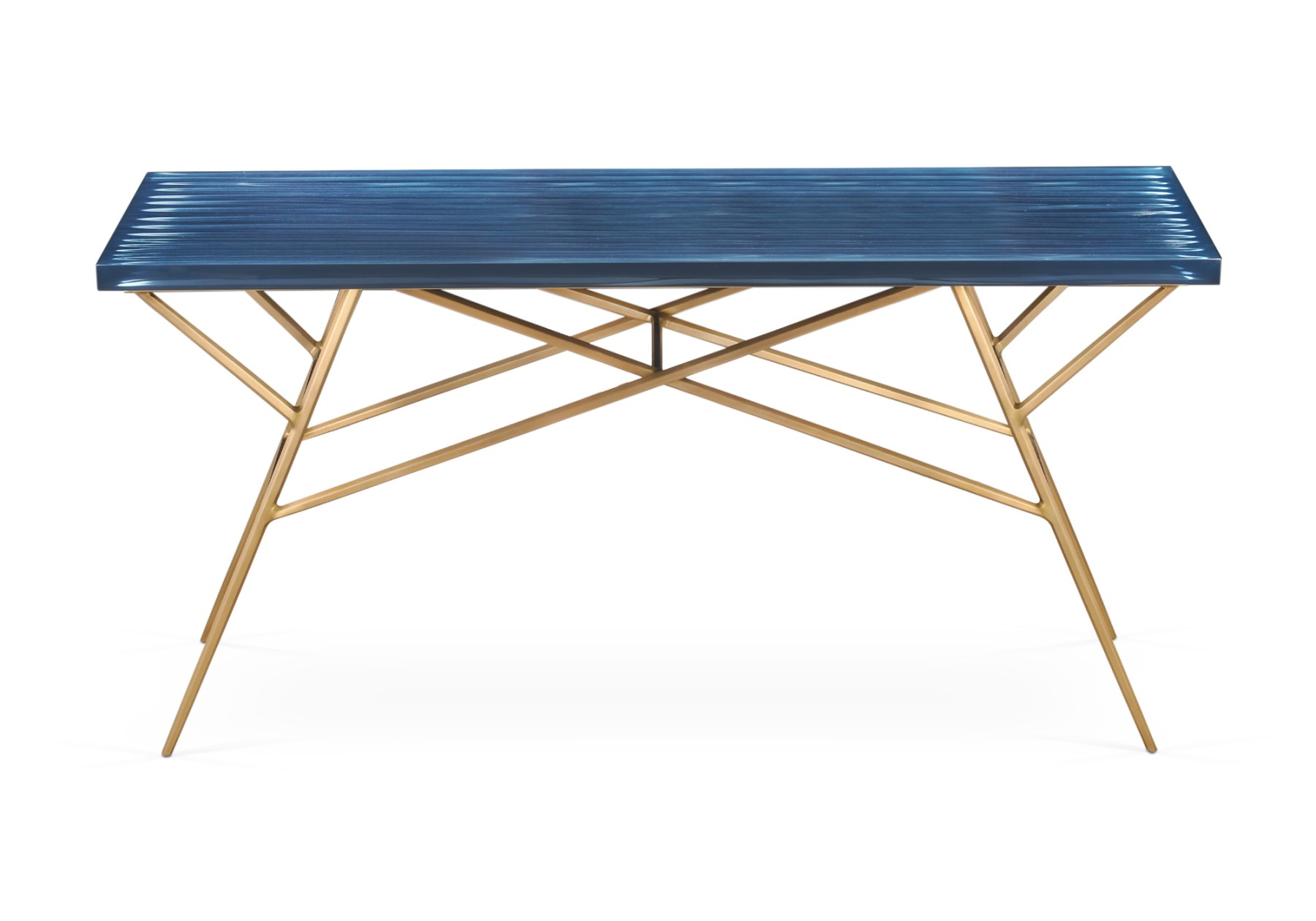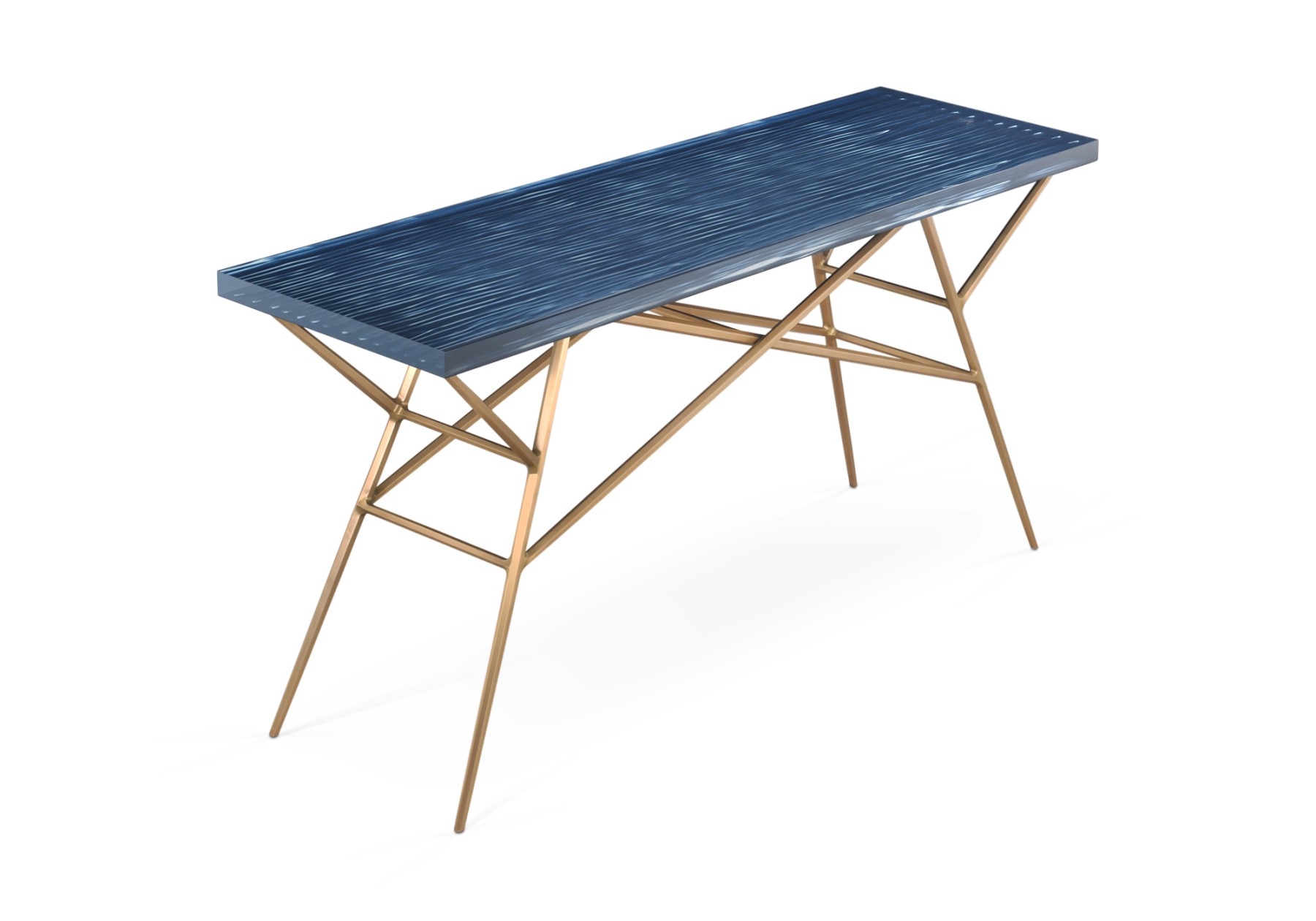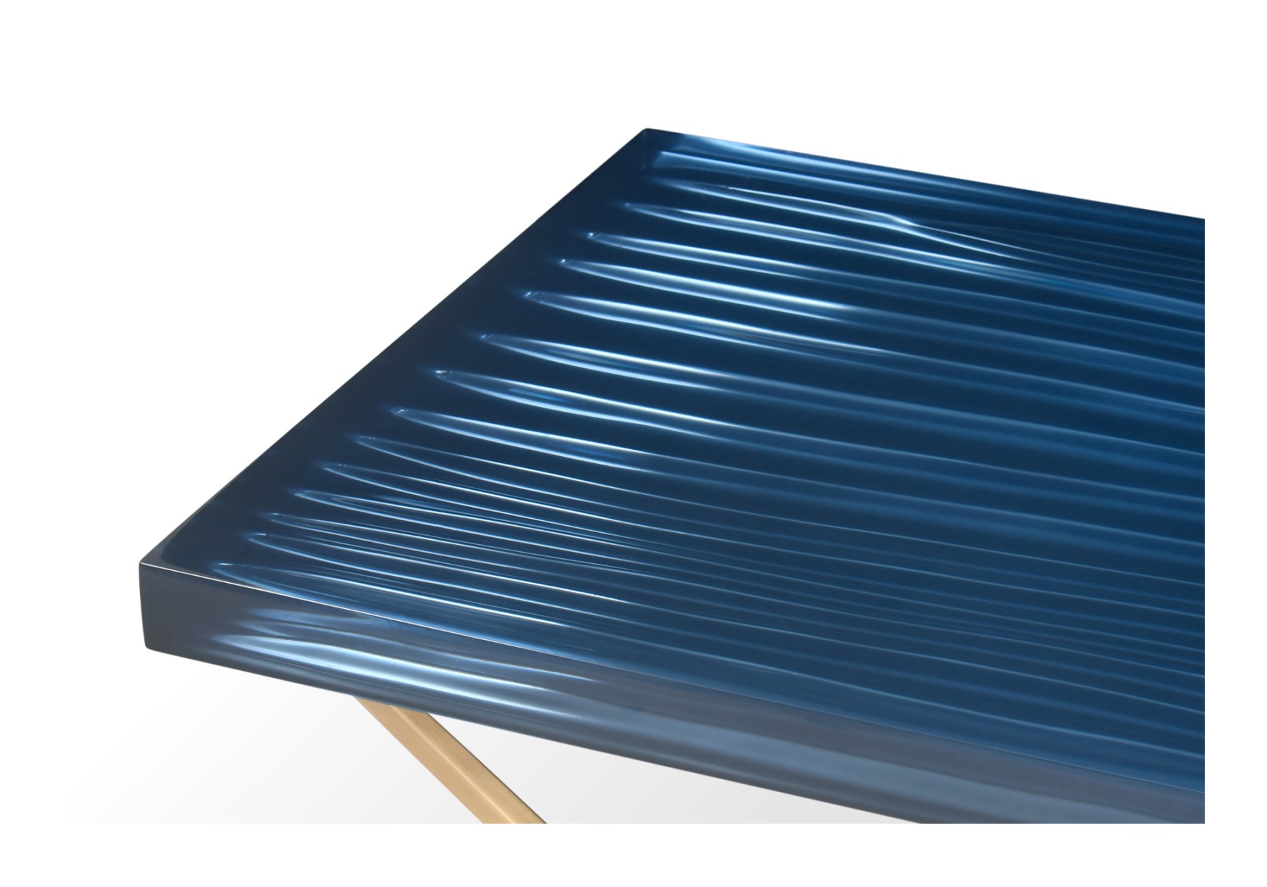 geometric metal base with silvered, translucent resin top in lac carved pattern