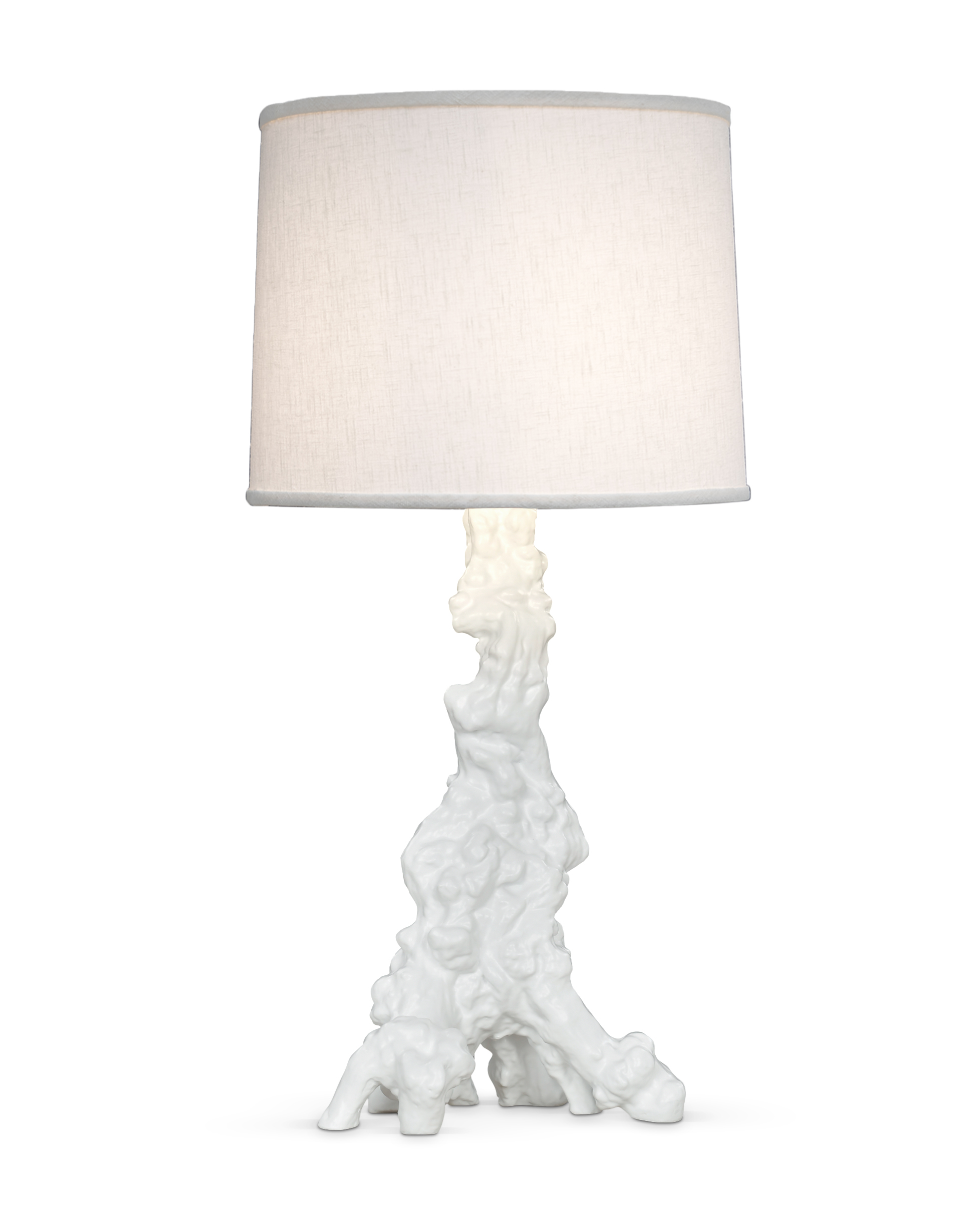 Brass-cast base in gnarled wood motif with white linen shade