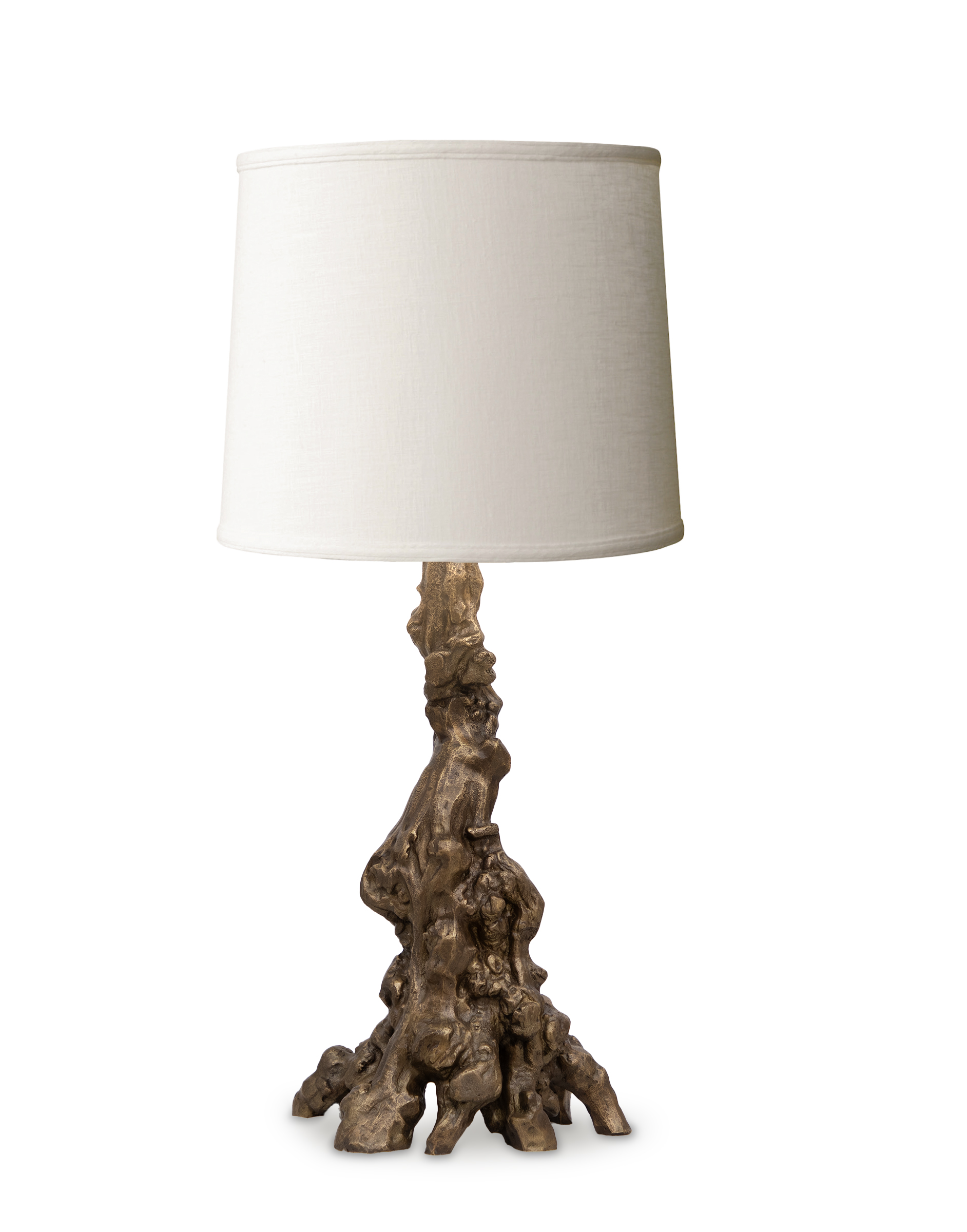 brass-cast base in gnarled wood motif with white linen shade