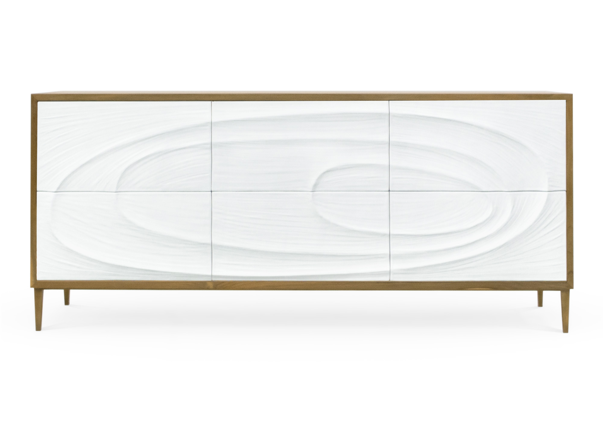 Wood encased cabinet with hand-carved resin drawers, sand cast brass feet