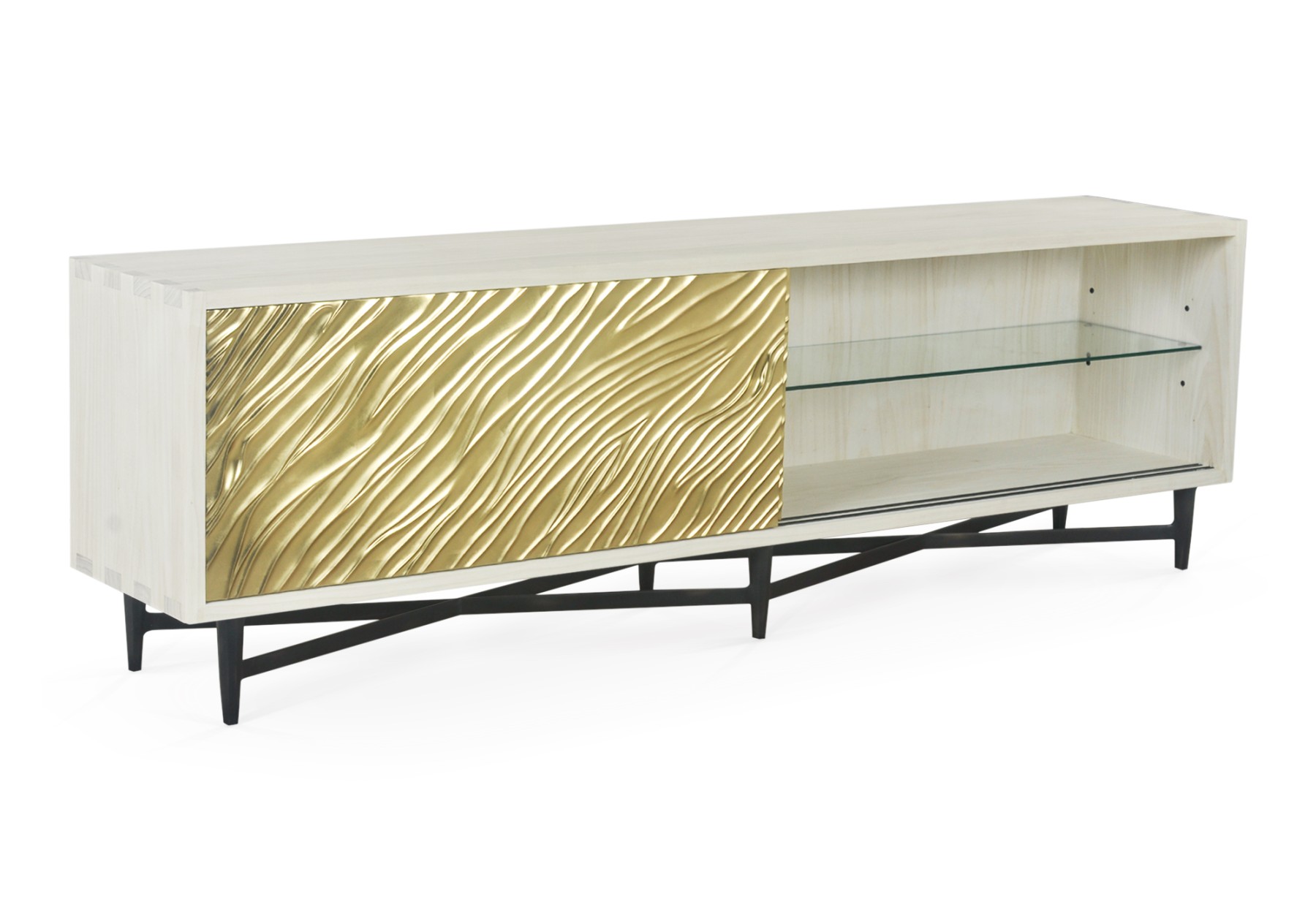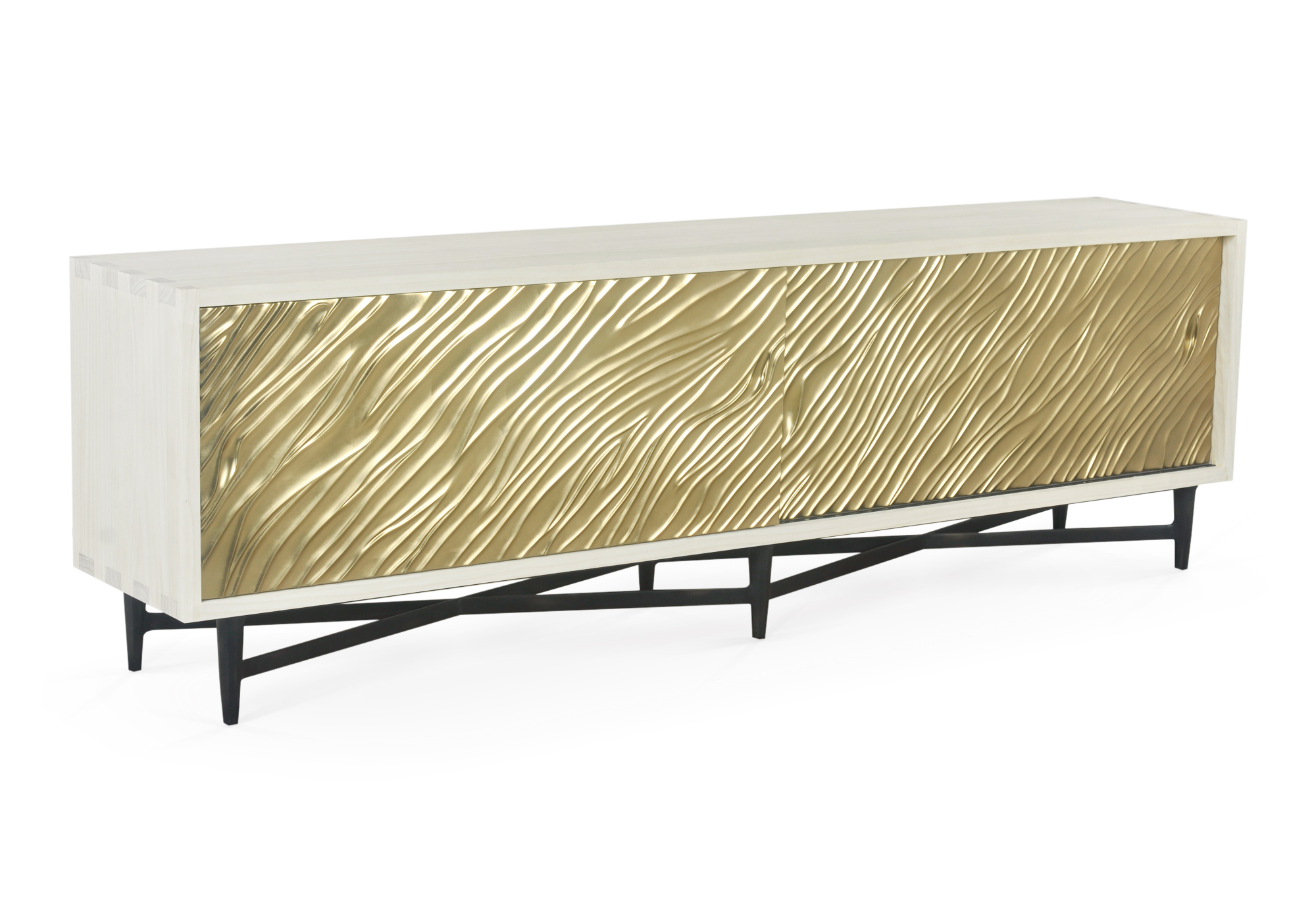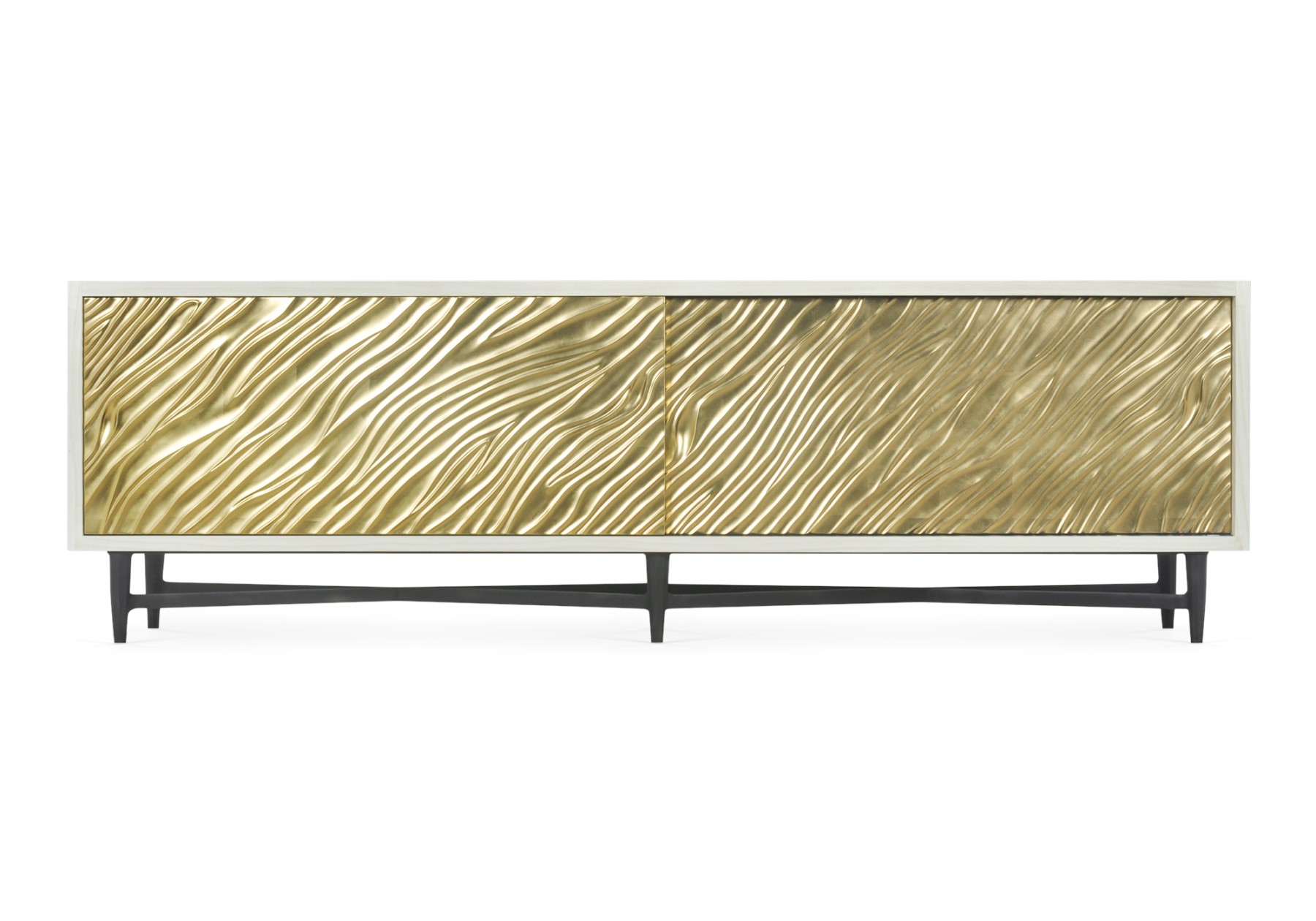 Hardwood and veneer cabinet with carved sliding doors, sand cast brass base