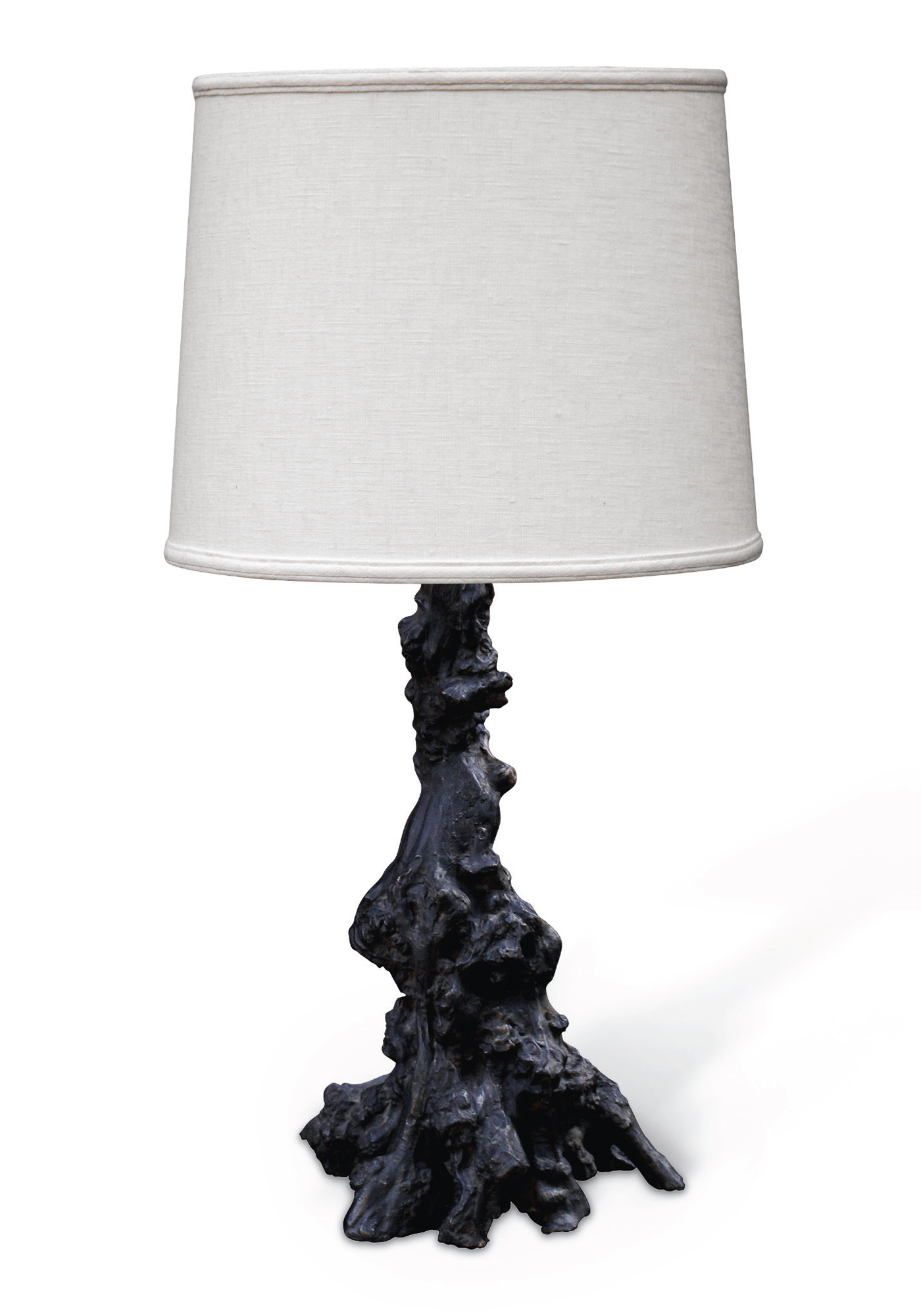 Brass-cast base in gnarled wood motif with white linen shade