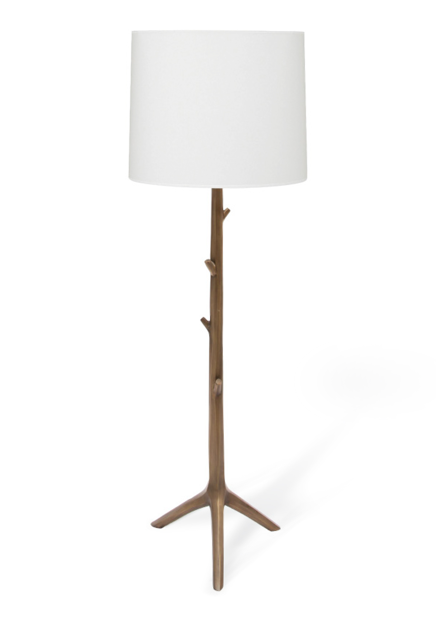 Hewn branch motif in cast brass with white linen shade